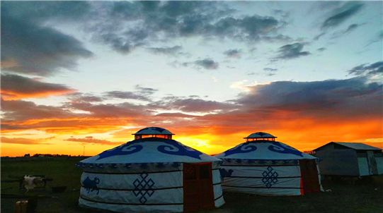 午餐后,到達【烏蘭山】在烏蘭山下,天然形成了一處類(lèi)似于太極八卦圖的自然景觀(guān),這是上帝之手的杰作,又似柔情女子無(wú)限眷戀著(zhù)草原情郎健壯寬闊的胸膛。此情此景令人叫絕! 游完以后我們驅車(chē)趕往【黑山頭日落山】車(chē)輛抵達黑山頭鎮,您可以徒步上山,等待著(zhù)草原上那美麗日落的出現。一望無(wú)際的草原加之蜿蜒曲折的河流,絕美的自然景觀(guān)為日落做好極佳的鋪墊,每逢日落時(shí)分太陽(yáng)靠近草原地平線(xiàn),飄蕩在草原之上的云彩被日落的光輝所渲染,此時(shí)的站在日落山之上仿佛置身金色世界,落日余暉灑在了草原濕地的曠野之上,萬(wàn)物被金色的暮光所籠罩。此時(shí)此刻無(wú)論是草原、濕地、河流紛紛被披上了一層淡淡的金色,只是這金色世界總是來(lái)的快去的也快,慢慢的金色世界轉為火紅色的世界,伴著(zhù)晚霞的消散太陽(yáng)慢慢的落在了草原天際之下......夜幕降臨后,夜晚的草原亮起了點(diǎn)點(diǎn)燈光,熱情的蒙古族朋友為大家點(diǎn)起了篝火,大人、小孩、男人、女人,那場(chǎng)面頗溫暖。那熊熊烈火將人的整個(gè)情緒都會(huì )融進(jìn)草原夜色中,和牧民一起圍火而跳,會(huì )是一種全新的感受。手撕羊肉,圍火而烤,像牧民一樣大塊吃肉大碗喝酒大聲吆喝。我們可以隨著(zhù)人群圍著(zhù)篝火舞蹈或者叫上您的三五好友,坐在一起看星星,談人生。